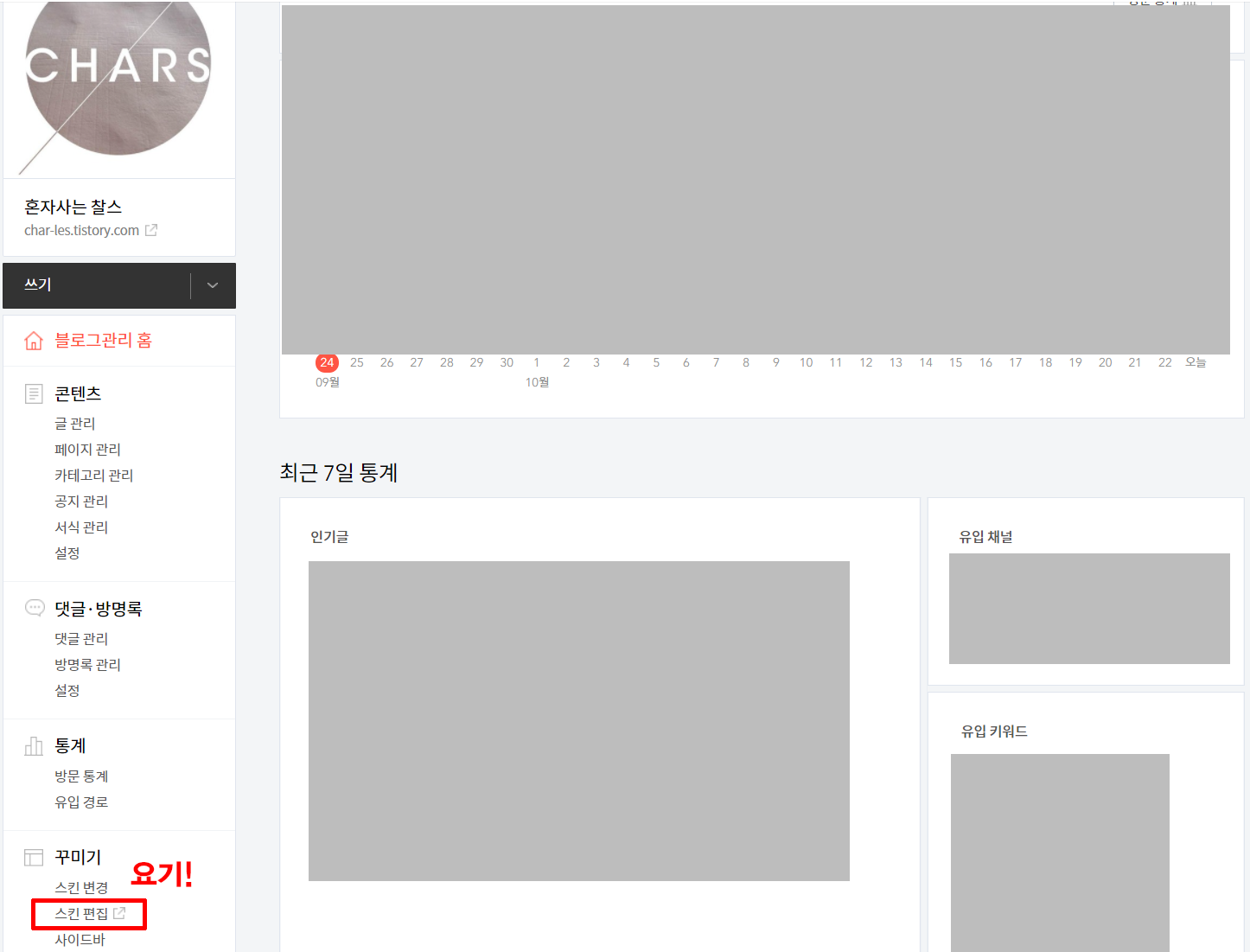 이걸 수정하기 위해 티스토리의 블로그편집 기능으로 들어가줍니다.